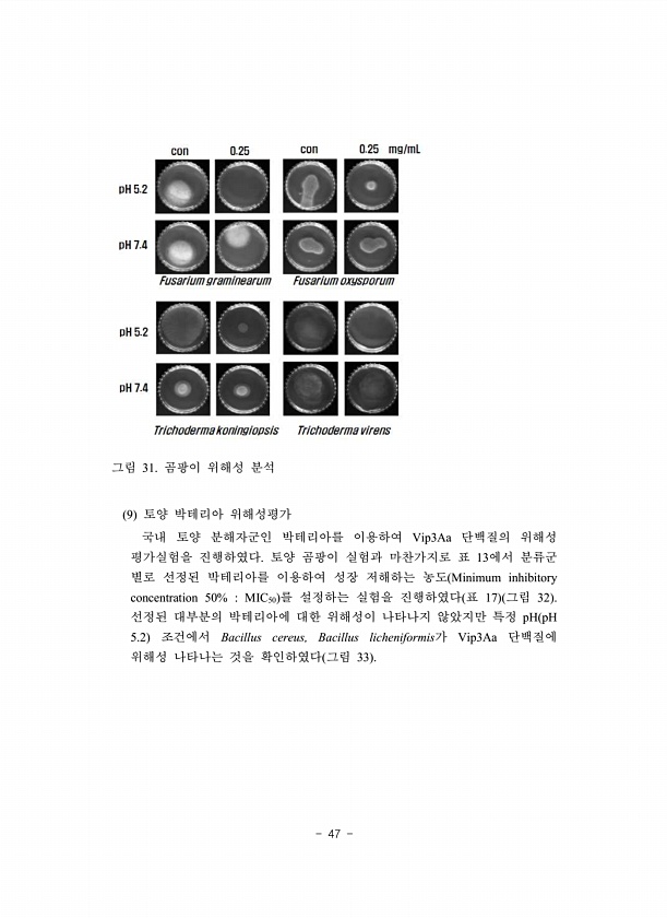 47 그림 31. 곰팡이 위해성 분석 9 토양 박테리아 위해성평가 국내 토양 분해자군인 박테리아를 이용하여 Vip3Aa 단백질의 위해성 평가실험을 진행하였다. 토양 곰팡이 실험과 마찬가지로 표 13에서 분류군 별로 선정된 박테리아를 이용하여 성장 저해하는 농도 Minimum inhibitory concentration 50% MIC50 를 설정하는 실험을 진행하였다 표 17 그림 32 선정된 대부분의 박테리아에 대한 위해성이 나타나지 않았지만 특정 pH pH 5.2 조건에서 Bacillus cereus, Bacillus licheniformis가 Vip3Aa 단백질에 위해성 나타나는 것을 확인하였다 그림 33