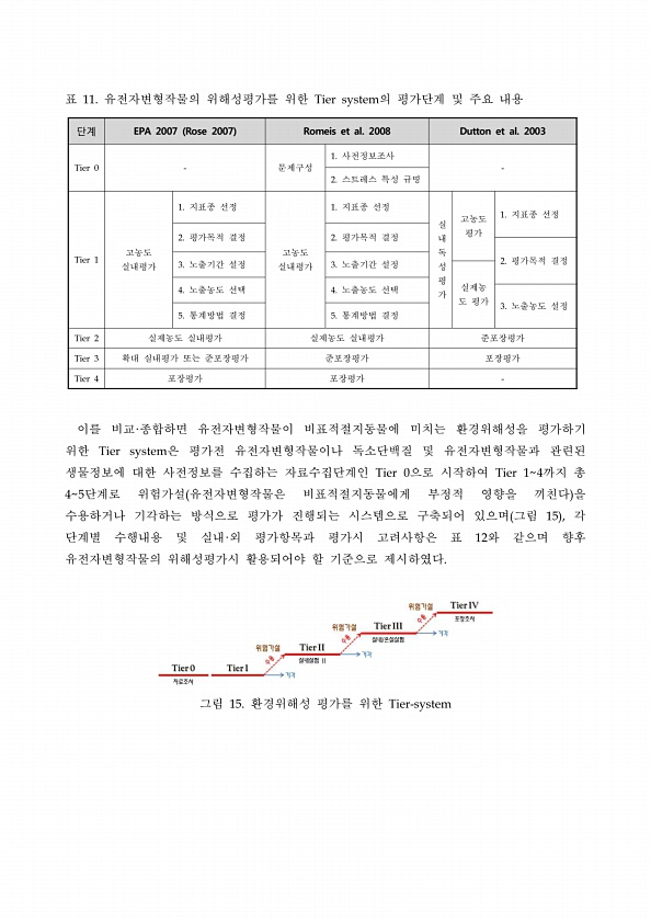 표 11. 유전자변형작물의 위해성평가를 위한 Tier system의 평가단계 및 주요 내용 단계 EPA 2007 Rose 2007 Romeis et al. 2008 Dutton et al. 2003 Tier 0 문제구성 1. 사전정보조사 2. 스트레스 특성 규명 Tier 1 고농도 실내평가 1. 지표종 선정 고농도 실내평가 1. 지표종 선정 실 내 독 성 평 가 고농도 평가 1. 지표종 선정 2. 평가목적 결정 2. 평가목적 결정 3. 노출기간 설정 3. 노출기간 설정 2. 평가목적 결정 실제농 도 평가 4. 노출농도 선택 4. 노출농도 선택 3. 노출농도 설정 5. 통계방법 결정 5. 통계방법 결정 Tier 2 실제농도 실내평가 실제농도 실내평가 준포장평가 Tier 3 확대 실내평가 또는 준포장평가 준포장...