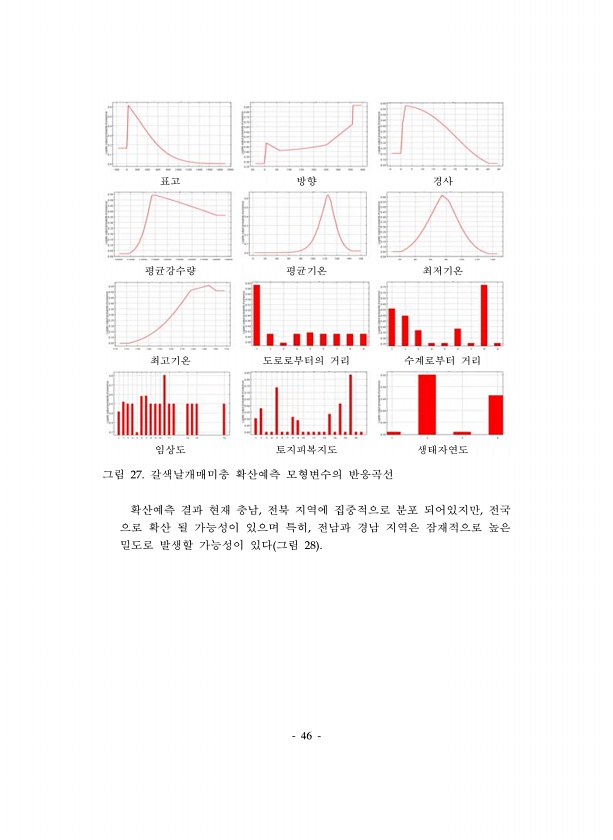 46 표고 방향 경사 평균강수량 평균기온 최저기온 최고기온 도로로부터의 거리 수계로부터 거리 임상도 토지피복지도 생태자연도 그림 27. 갈색날개매미충 확산예측 모형변수의 반응곡선 확산예측 결과 현재 충남, 전북 지역에 집중적으로 분포 되어있지만, 전국 으로 확산 될 가능성이 있으며 특히, 전남과 경남 지역은 잠재적으로 높은 밀도로 발생할 가능성이 있다 그림 28