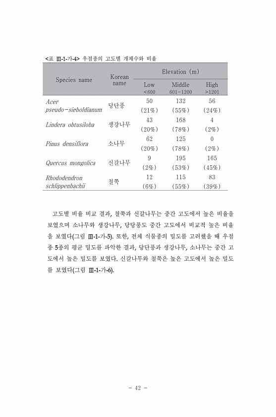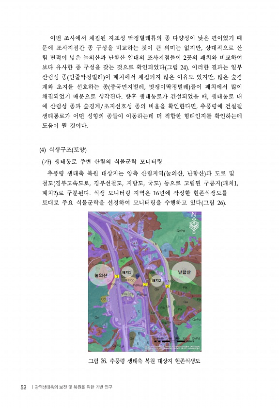 52 이번 조사에서 채집된 지표성 딱정벌레류의 종 다양성이 낮은 편이었기 때 문에 조사지점간 종 구성을 비교하는 것이 큰 의미는 없지만 상대적으로 산 림 면적이 넓은 눌의산과 난함산 일대의 조사지점들이 곳의 패치와 비교하여 보다 유사한 종 구성을 갖는 것으로 확인되었다 그림 이러한 결과는 일부 산림성 종 민줄딱정벌레 이 패치에서 채집되지 않은 이유도 있지만 많은 숲경 계와 초지를 선호하는 종 중국먼지벌레 멋쟁이딱정벌레 들이 패치에서 많이 채집되었기 때문으로 생각된다 향후 생태통로가 건설되었을 때 생태통로 내 에 산림성 종과 숲경계 초지선호성 종의 비율을 확인한다면 추풍령에 건설될 생태통로가 어떤 성향의 종들이 이동하는데 더 적합한 형태인지를 확인하는데 도움이 될 것이다 식생구조 토양 가 생태통로 주변 산림의...