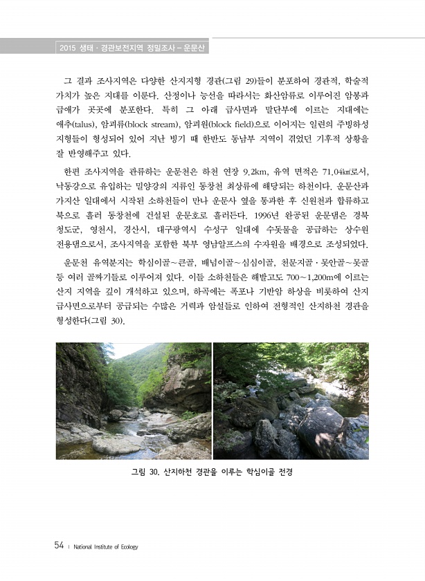 2015 생태·경관보전지역 정밀조사 운문산 54 ? National Institute of Ecology 그 결과 조사지역은 다양한 산지지형 경관 그림 29 들이 분포하여 경관적, 학술적 가치가 높은 지대를 이룬다. 산정이나 능선을 따라서는 화산암류로 이루어진 암봉과 급애가 곳곳에 분포한다. 특히 그 아래 급사면과 말단부에 이르는 지대에는 애추 talus , 암괴류 block stream , 암괴원 block field 으로 이어지는 일련의 주빙하성 지형들이 형성되어 있어 지난 빙기 때 한반도 동남부 지역이 겪었던 기후적 상황을 잘 반영해주고 있다. 한편 조사지역을 관류하는 운문천은 하천 연장 9.2km, 유역 면적은 71.04㎢로서, 낙동강으로 유입하는 밀양강의 지류인 동창천 최상류에 해당되는 하천이다. ...