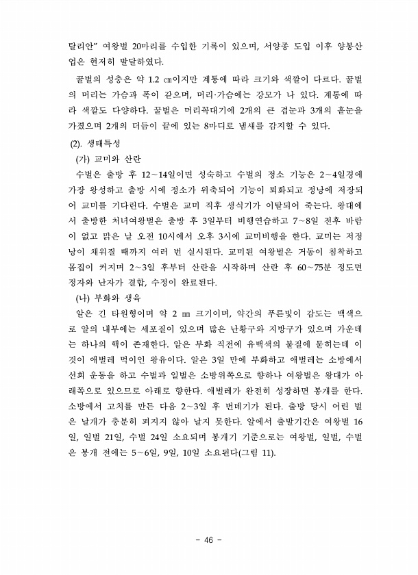 탈리안” 여왕벌 20마리를 수입한 기록이 있으며, 서양종 도입 이후 양봉산 업은 현저히 발달하였다. 꿀벌의 성충은 약 1.2 ㎝이지만 계통에 따라 크기와 색깔이 다르다. 꿀벌 의 머리는 가슴과 폭이 같으며, 머리·가슴에는 강모가 나 있다. 계통에 따 라 색깔도 다양하다. 꿀벌은 머리꼭대기에 2개의 큰 겹눈과 3개의 홑눈을 가졌으며 2개의 더듬이 끝에 있는 8마디로 냄새를 감지할 수 있다. 2 생태특성 가 교미와 산란 수벌은 출방 후 12∼14일이면 성숙하고 수벌의 정소 기능은 2∼4일경에 가장 왕성하고 출방 시에 정소가 위축되어 기능이 퇴화되고 정낭에 저장되 어 교미를 기다린다. 수벌은 교미 직후 생식기가 이탈되어 죽는다. 왕대에 서 출방한 처녀여왕벌은 출방 후 3일부터 비행연습하고 7∼8일 전후 바람 이 ...