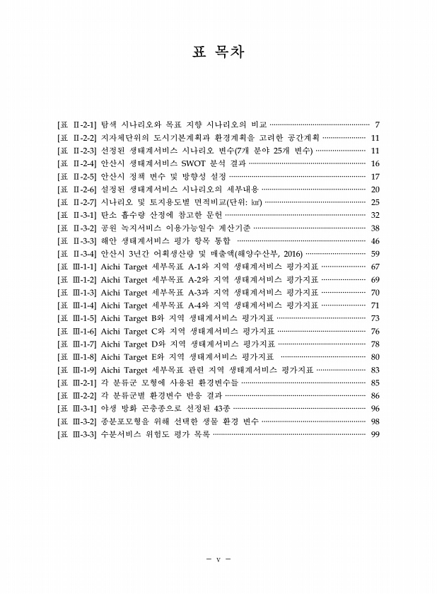 v 표 목차 [표 Ⅱ-2-1] 탐색 시나리오와 목표 지향 시나리오의 비교 ················································· 7 [표 Ⅱ-2-2] 지자체단위의 도시기본계획과 환경계획을 고려한 공간계획 ····················· 11 [표 Ⅱ-2-3] 선정된 생태계서비스 시나리오 변수 7개 분야 25개 변수 ························ 11 [표 Ⅱ-2-4] 안산시 생태계서비스 SWOT 분석 결과 ························································· 16 [표 Ⅱ-2-5] 안산시 정책 변수 및 방향성 설정 ··················································...