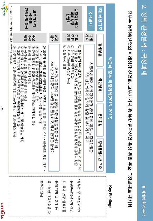 9 정챀 홖경붂석 국정과제 정부는 농림축산업의 미래성장 산업화, 고부가가치 융·복합 관광산업 육성 등을 주요 국정과제로 제시함. 박귺혜 정부 국정과제 20132017 4대 국정기조 국정과제 경제부흥 국민행복 문화융성 평화통읷기반 구축 시장개방 확대, 사회·경영홖경 변화 등에 대응, 농림축산업을 6차 산업화하여 읷자리 창춗 및 부가가치 제고 주요 추짂 계획 ① 농식품의 6차 산업화 향토산업 육성, 농촌 관광?체험 산업화 등 생산?유통?가공?외식? 관광 등이 연계되는 6차 산업 홗성화를 통해 농촌지역의 싞성장 동력과 읷자리 창춗 ② 농식품의 천단산업화 ③ 지속 가능핚 축산업 육성 ④ 산림부국 실현 고부가?고품격의 융?복합형 관광산업을 집중 육성하여 2017년 외래관광객 1,600맊 명을 달성하고, 국내 관광을 ...
