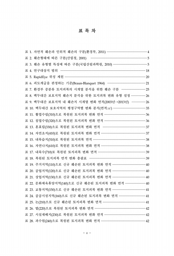 v 표 목 차 표 1. 자연적 훼손과 인위적 훼손의 구분 환경부, 2011 ··················································4 표 2. 훼손형태에 따른 구분 산림청, 2001 ······································································5 표 3. 훼손 유형별 특징에 따른 구분 국립산림과학원, 2010 ··········································5 표 4. 연구대상지 범위 ·········································································································18 표 5. ...