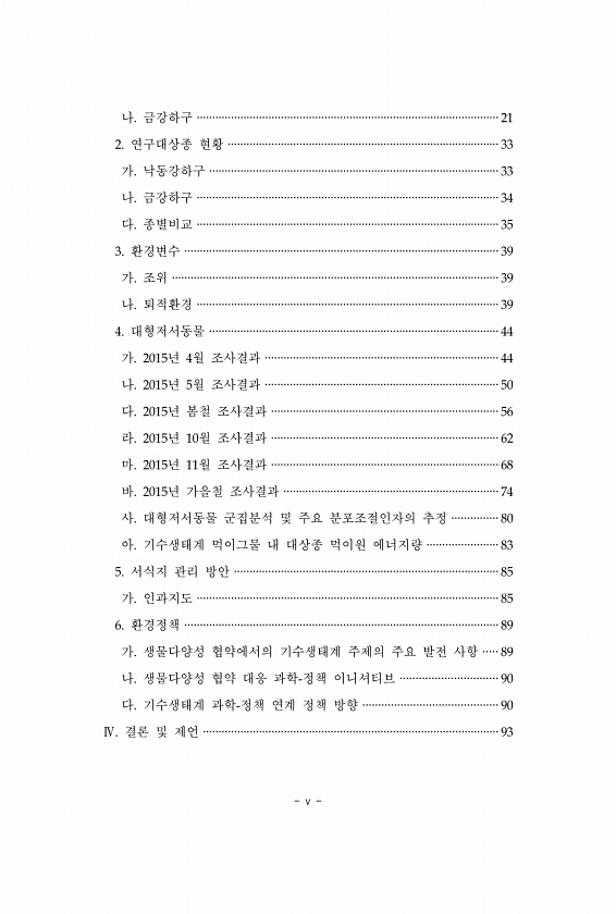 v 나. 금강하구 ·································································································21 2. 연구대상종 현황 ·······················································································33 가. 낙동강하구 ·····························································································33 나. 금강하구 ···········································································...