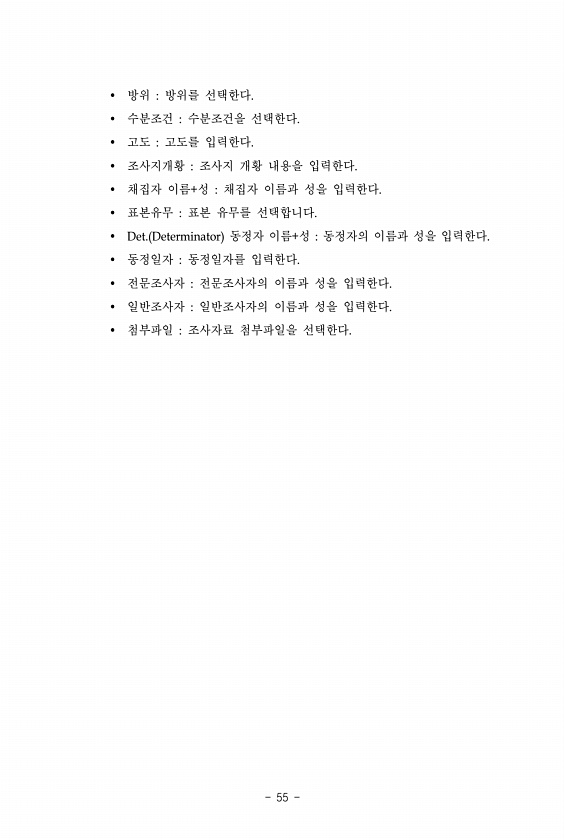 55 ? 방위 방위를 선택한다. ? 수분조건 수분조건을 선택한다. ? 고도 고도를 입력한다. ? 조사지개황 조사지 개황 내용을 입력한다. ? 채집자 이름+성 채집자 이름과 성을 입력한다. ? 표본유무 표본 유무를 선택합니다. ? Det. Determinator 동정자 이름+성 동정자의 이름과 성을 입력한다. ? 동정일자 동정일자를 입력한다. ? 전문조사자 전문조사자의 이름과 성을 입력한다. ? 일반조사자 일반조사자의 이름과 성을 입력한다. ? 첨부파일 조사자료 첨부파일을선택한다.