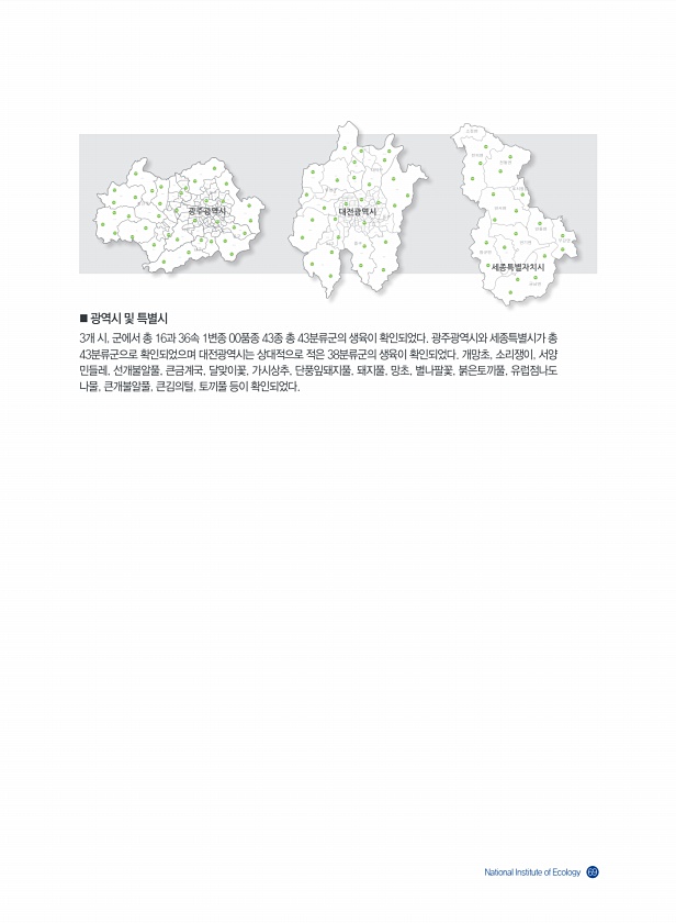 National Institute of Ecology 69 ■ 광역시 및 특별시 3개 시, 군에서 총 16과 36속 1변종 00품종 43종 총 43분류군의 생육이 확인되었다. 광주광역시와 세종특별시가 총 43분류군으로 확인되었으며 대전광역시는 상대적으로 적은 38분류군의 생육이 확인되었다. 개망초, 소리쟁이, 서양 민들레, 선개불알풀, 큰금계국, 달맞이꽃, 가시상추, 단풍잎돼지풀, 돼지풀, 망초, 별나팔꽃, 붉은토끼풀, 유럽점나도 나물, 큰개불알풀, 큰김의털, 토끼풀 등이확인되었다.