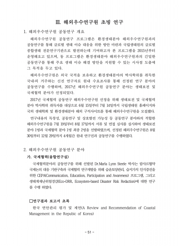51 III. 해외우수연구원 초빙 연구 1. 해외우수연구원 공동연구 개요 해외우수연구원 공동연구 프로그램은 환경생태분야 해외우수연구원과의 공동연구를 통해 글로벌 생태 이슈 대응을 위한 방안 마련과 국립생태원의 글로벌 종합생태 전문연구기관으로 발전하는데 기여하고자 본 프로그램을 2015년부터 운영해오고 있으며, 동 프로그램은 환경생태분야 해외우수연구원과의 긴밀한 공동연구를 통해 주요 생태 이슈 해결 방안을 지원할 수 있는 시사점 도출에 그 목적을 두고 있다. 해외우수연구원은 외국 국적을 보유하고 환경생태분야의 박사학위를 취득한 국내?외 거주하는 신진 연구자로 원내 수요조사를 통해 선정된 연구 분야의 공동연구를 수행하며, 2017년 해외우수연구원 공동연구 분야는 생태보전 및 국제협력 분야가 선정되었다. 2017...