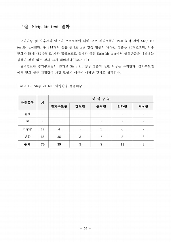 56 4절. Strip kit test 결과 모니터링 및 사후관리 연구의 프로토콜에 의해 모든 채집샘플은 PCR 분석 전에 Strip kit test를 실시했다. 총 314개의 샘플 중 kit test 양성 반응이 나타난 샘플은 70개였으며, 이중 면화가 58개 82.9% 로 가장 많았으므로 유채와 콩은 Strip kit test에서 양성반응을 나타내는 샘플이 전혀 없는 것과 크게 대비된다 Table 12 권역별로는 경기수도권이 39개로 Strip kit 양성 샘플의 절반 이상을 차지한다. 경기수도권 에서 면화 샘플 채집량이 가장 많았기 때문에 나타난 결과로 생각된다. 작물종류 계 권 역 구 분 경기수도권 강원권 충청권 전라권 경상권 유채 ? ? ? ? ? ? 콩 ? ? ? ? ? ? 옥수수 12 4 ? 2...