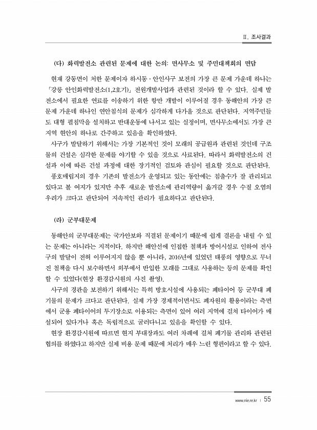 Ⅱ. 조사결과 www.nie.re.kr ? 55 다 화력발전소 관련된 문제에 대한 논의면사무소 및 주민대책회의 면담 현재 강동면이 처한 문제이자 하시동·안인사구 보전의 가장 큰 문제 가운데 하나는 「강릉 안인화력발전소 1,2호기 」전원개발사업과 관련된 것이라 할 수 있다. 실제 발 전소에서 필요한 연료를 이송하기 위한 항만 개발이 이루어질 경우 동해안의 가장 큰 문제 가운데 하나인 연안침식의 문제가 심각하게 다가올 것으로 판단된다. 지역주민들 도 대형 펼침막을 설치하고 반대운동에 나서고 있는 실정이며, 면사무소에서도 가장 큰 지역 현안의 하나로 간주하고 있음을 확인하였다. 사구가 발달하기 위해서는 가장 기본적인 것이 모래의 공급원과 관련된 것인데 구조 물의 건설은 심각한 문제를 야기할 수 있을 것으로 사료된...