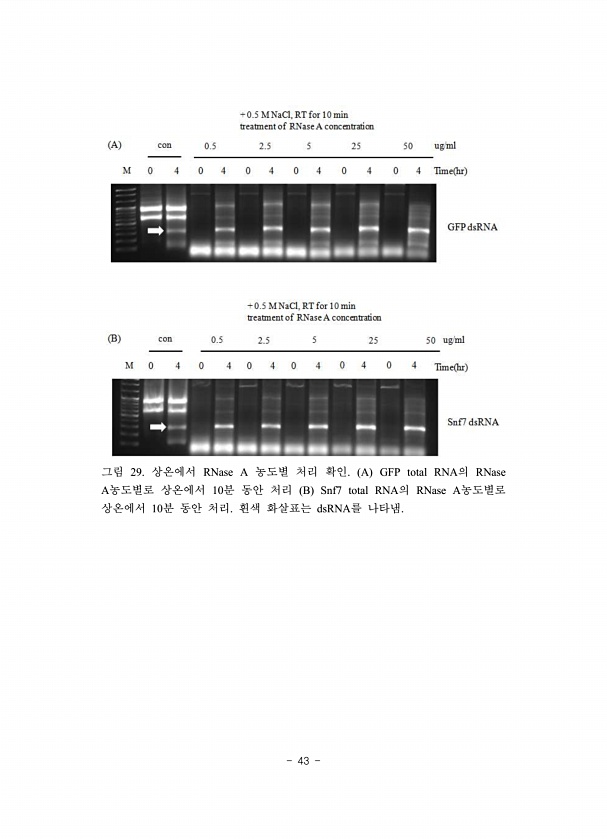 43 그림 29. 상온에서 RNase A 농도별 처리 확인. A GFP total RNA의 RNase A농도별로 상온에서 10분 동안 처리 B Snf7 total RNA의 RNase A농도별로 상온에서 10분 동안 처리. 흰색 화살표는 dsRNA를나타냄.