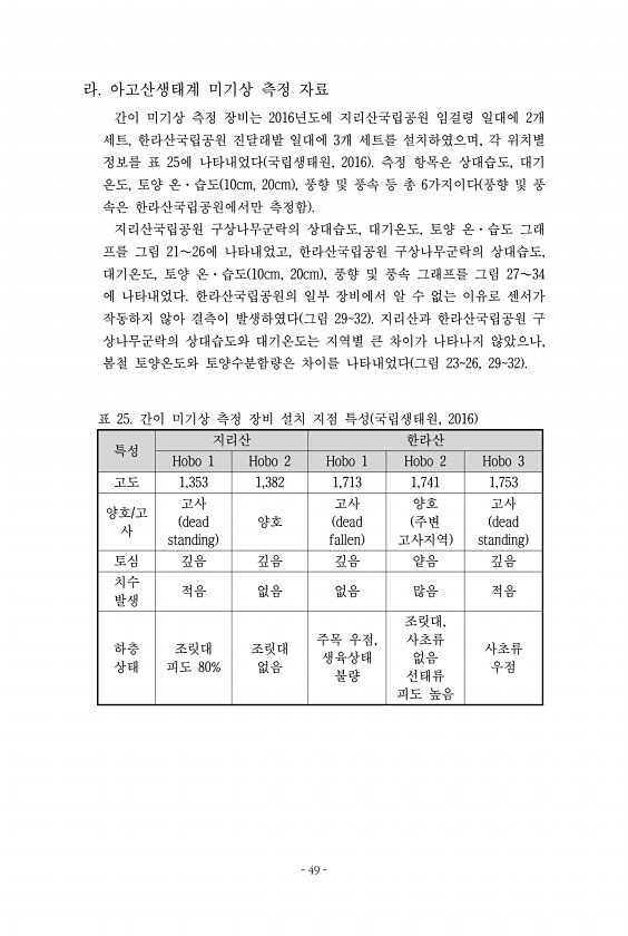 라. 아고산생태계 미기상 측정 자료 간이 미기상 측정 장비는 2016년도에 지리산국립공원 임걸령 일대에 2개 세트, 한라산국립공원 진달래밭 일대에 3개 세트를 설치하였으며, 각 위치별 정보를 표 25에 나타내었다 국립생태원, 2016 측정 항목은 상대습도, 대기 온도, 토양 온·습도 10cm, 20cm , 풍향 및 풍속 등 총 6가지이다 풍향 및 풍 속은 한라산국립공원에서만 측정함 지리산국립공원 구상나무군락의 상대습도, 대기온도, 토양 온·습도 그래 프를 그림 21∼26에 나타내었고, 한라산국립공원 구상나무군락의 상대습도, 대기온도, 토양 온·습도 10cm, 20cm , 풍향 및 풍속 그래프를 그림 27∼34 에 나타내었다. 한라산국립공원의 일부 장비에서 알 수 없는 이유로 센서가 작동하지 않아 결측이 발생...