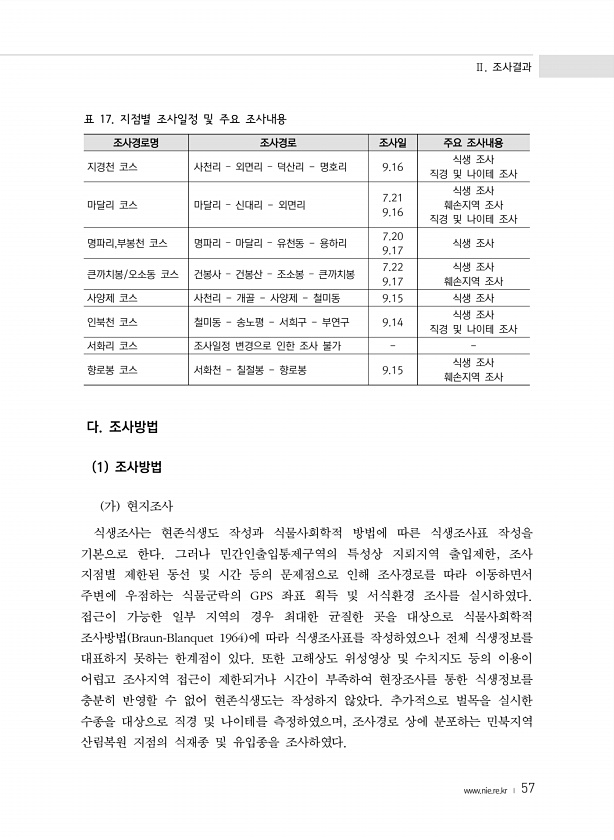 Ⅱ. 조사결과 www.nie.re.kr ? 57 조사경로명 조사경로 조사일 주요 조사내용 지경천 코스 사천리 ? 외면리 ? 덕산리 명호리 9.16 식생 조사 직경 및 나이테 조사 마달리 코스 마달리 ? 신대리 외면리 7.21 9.16 식생 조사 훼손지역 조사 직경 및 나이테 조사 명파리,부봉천 코스 명파리 ? 마달리 ? 유천동 용하리 7.20 9.17 식생 조사 큰까치봉/오소동 코스 건봉사 ? 건봉산 ? 조소봉 ? 큰까치봉 7.22 9.17 식생 조사 훼손지역 조사 사양제 코스 사천리 개골 사양제 철미동 9.15 식생 조사 인북천 코스 철미동 송노평 서희구 부연구 9.14 식생 조사 직경 및 나이테 조사 서화리 코스 조사일정 변경으로 인한 조사 불가 향로봉 코스 서화천 칠절봉 향로봉 9.15 식생 조사 훼손...