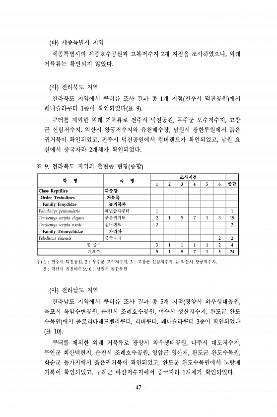 47 바 세종특별시 지역 세종특별시의 세종호수공원과 고복저수지 2개 지점을 조사하였으나, 외래 거뷱류는 확인되지 않았다. 사 전라북도 지역 전라북도 지역에서 쿠터류 조사 결과 총 1개 지점 전주시 덕진공원 에서 페니슐라쿠터 1종이 확인되었다 표 9 쿠터를 제외한 외래 거북류로 전주시 덕진공원, 무주군 모수저수지, 고창 군 신림저수지, 익산시 왕궁저수지와 유천배수장, 남원시 광한루원에서 붉은 귀거북이 확인되었고, 전주시 덕진공원에서 컴버랜드가 확인되었고, 남원 요 천에서 중국자라 2개체가 확인되었다. 표 9. 전라북도 지역의 출현종 현황 종합 학 명 국 명 조사지점 1 2 3 4 5 6 종합 Class Reptilies 파충강 Order Testudines 거북목 Family Emydidae 늪거북과 Pseu...