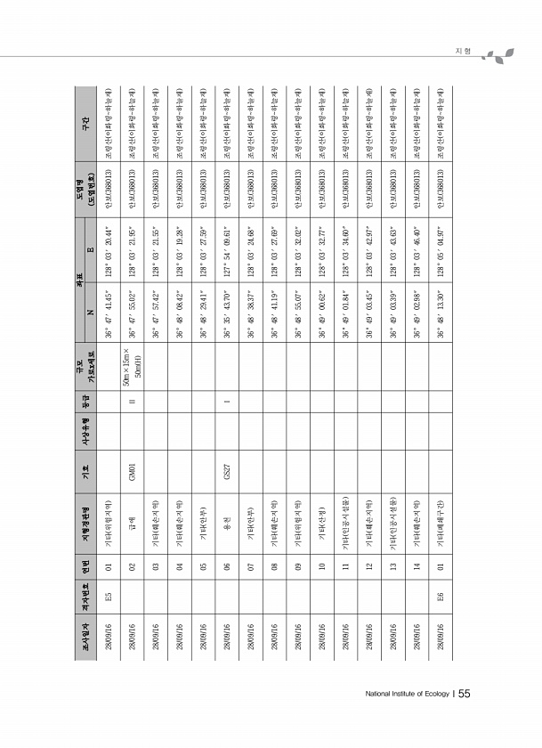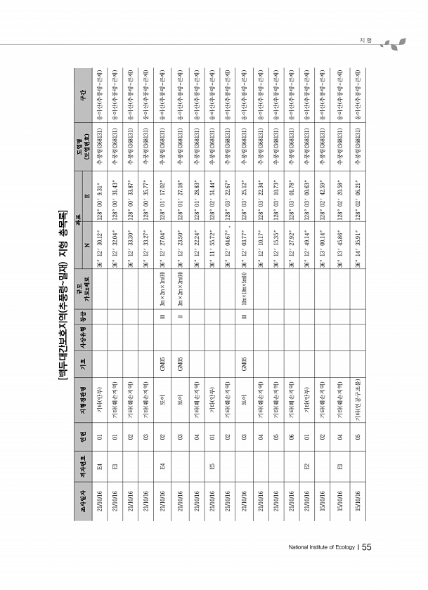 지 형 National Institute of EcologyⅠ55 조사일자 격자번호 연번 지형경관명 기호 사상유형 등급 규모 가로x세로 좌표 도엽명 N E 도엽번호 구간 21/10/16 E4 01 기타 안부 36° 12′ 30.12″ 128° 00′ 9.31″ 추풍령 368131 웅이산 추풍령-큰재 21/10/16 E1 01 기타 훼손지역 36° 12′ 32.04″ 128° 00′ 31.43″ 추풍령 368131 웅이산 추풍령-큰재 21/10/16 02 기타 훼손지역 36° 12′ 33.30″ 128° 00′ 33.87″ 추풍령 368131 웅이산 추풍령-큰재 21/10/16 03 기타 훼손지역 36° 12′ 33.27″ 128° 00′ 35.77″ 추풍령 368131 웅이산 추풍령-큰재 21/10/16 E...
