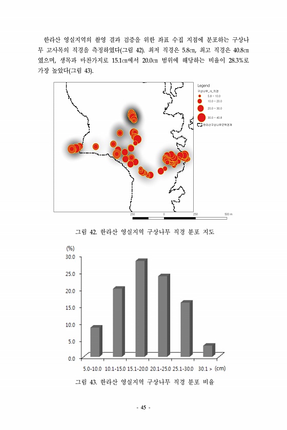 45 한라산 영실지역의 촬영 결과 검증을 위한 좌표 수집 지점에 분포하는 구상나 무 고사목의 직경을 측정하였다 그림 42 최저 직경은 5.8㎝, 최고 직경은 40.8㎝ 였으며, 생목과 마찬가지로 15.1㎝에서 20.0㎝ 범위에 해당하는 비율이 28.3%로 가장 높았다 그림 43 그림 42. 한라산 영실지역 구상나무 직경 분포 지도 그림 43. 한라산 영실지역 구상나무 직경 분포비율