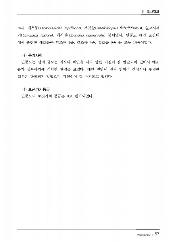 Ⅱ. 조사결과 www.nie.re.kr ? 57 nsii , 개우무 Pterocladiella capillacea , 부챗살 Ahnfeltiopsis flabelliformis , 잎꼬시래 기 Gracilaria textorii , 개서실 Chondria crassicaulis 등이었다. 만풍도 해안 조간대 에서 출현한 해조류는 녹조류 1종, 갈조류 3종, 홍조류 9종 등 모두 13종이었다. ③ 특기사항 만풍도는 섬의 규모는 작으나 해안을 따라 암반 기질이 잘 발달되어 있어서 해조 류가 생육하기에 적합한 환경을 보였다. 해안 전반에 걸쳐 인위적 간섭이나 뚜렷한 훼손은 관찰되지 않았으며 자연성이 잘 유지되고 있었다. ④ 보전가치등급 만풍도의 보전가치 등급은 II로평가되었다.
