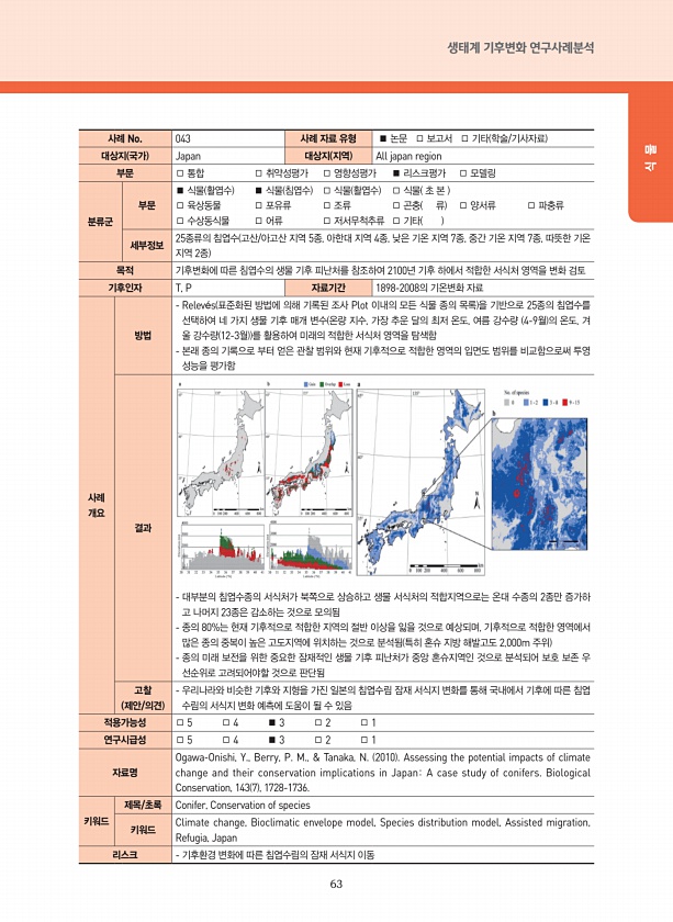 63 생태계 기후변화 연구사례분석 식 물 사례 No. 043 사례 자료 유형 ■ 논문 □ 보고서 □ 기타 학술/기사자료 대상지 국가 Japan 대상지 지역 All japan region 부문 □ 통합 □ 취약성평가 □ 영향성평가 ■ 리스크평가 □ 모델링 분류군 부문 ■ 식물 활엽수 ■ 식물 침엽수 □ 식물 활엽수 □ 식물 초 본 □ 육상동물 □ 포유류 □ 조류 □ 곤충 류 □ 양서류 □ 파충류 □ 수상동식물 □ 어류 □ 저서무척추류 □ 기타 세부정보 25종류의 침엽수 고산/아고산 지역 5종, 아한대 지역 4종, 낮은 기온 지역 7종, 중간 기온 지역 7종, 따뜻한 기온 지역 2종 목적 기후변화에 따른 침엽수의 생물 기후 피난처를 참조하여 2100년 기후 하에서 적합한 서식처 영역을 변화 검토 기후인자 T, ...