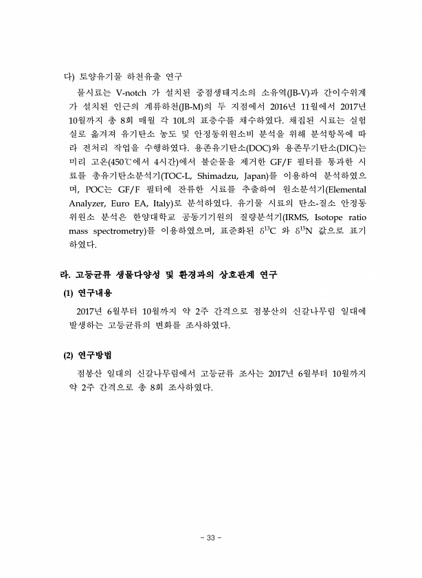 다 토양유기물 하천유출 연구 물시료는 V-notch 가 설치된 중점생태지소의 소유역 JB-V 과 간이수위계 가 설치된 인근의 계류하천 JB-M 의 두 지점에서 2016년 11월에서 2017년 10월까지 총 8회 매월 각 10L의 표층수를 채수하였다. 채집된 시료는 실험 실로 옮겨져 유기탄소 농도 및 안정동위원소비 분석을 위해 분석항목에 따 라 전처리 작업을 수행하였다. 용존유기탄소 DOC 와 용존무기탄소 DIC 는 미리 고온 450℃에서 4시간 에서 불순물을 제거한 GF/F 필터를 통과한 시 료를 총유기탄소분석기 TOC-L, Shimadzu, Japan 를 이용하여 분석하였으 며, POC는 GF/F 필터에 잔류한 시료를 추출하여 원소분석기 Elemental Analyzer, Euro EA, Italy 로 분...