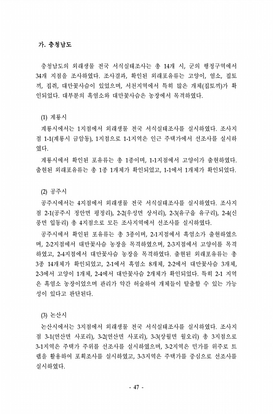 47 가. 충청남도 충청남도의 외래생물 전국 서식실태조사는 총 14개 시, 군의 행정구역에서 34개 지점을 조사하였다. 조사결과, 확인된 외래포유류는 고양이, 염소, 집토 끼, 집쥐, 대만꽃사슴이 있었으며, 서천지역에서 특히 많은 개체 집토끼 가 확 인되었다. 대부분의 흑염소와 대만꽃사슴은 농장에서 목격하였다. 1 계룡시 계룡시에서는 1지점에서 외래생물 전국 서식실태조사를 실시하였다. 조사지 점 1-1 계룡시 금암동 , 1지점으로 1-1지역은 인근 주택가에서 선조사를 실시하 였다. 계룡시에서 확인된 포유류는 총 1종이며, 1-1지점에서 고양이가 출현하였다. 출현된 외래포유류는 총 1종 1개체가 확인되었고, 1-1에서 1개체가 확인되었다. 2 공주시 공주시에서는 4지점에서 외래생물 전국 서식실태조사를 실시하였...