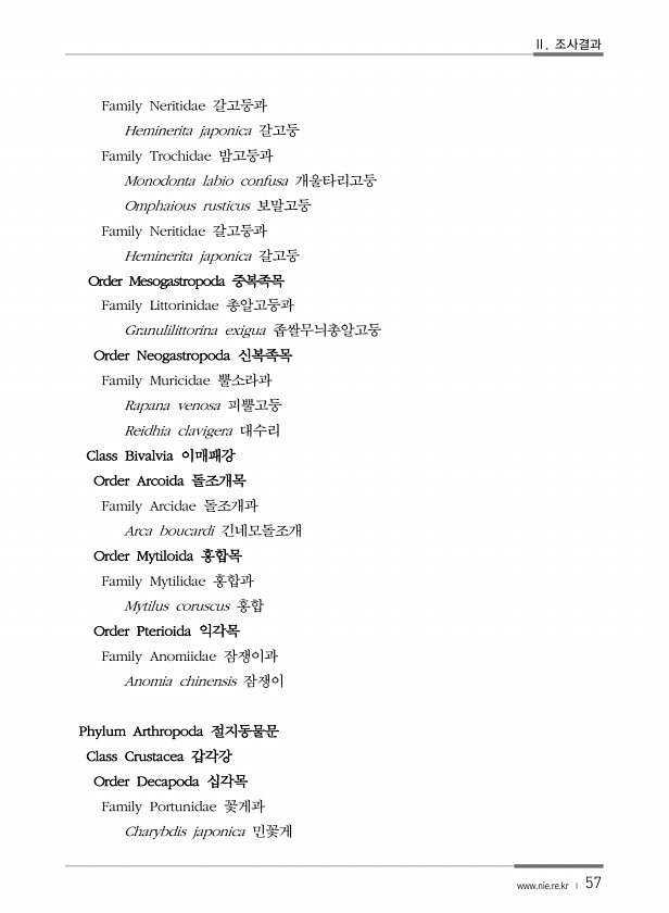 Ⅱ. 조사결과 www.nie.re.kr ? 57 Family Neritidae 갈고둥과 Heminerita japonica 갈고둥 Family Trochidae 밤고둥과 Monodonta labio confusa 개울타리고둥 Omphaious rusticus 보말고둥 Family Neritidae 갈고둥과 Heminerita japonica 갈고둥 Order Mesogastropoda 중복족목 Family Littorinidae 총알고둥과 Granulilittorina exigua 좁쌀무늬총알고둥 Order Neogastropoda 신복족목 Family Muricidae 뿔소라과 Rapana venosa 피뿔고둥 Reidhia clavigera 대수리 Class Bivalvia 이매패강 Order Arcoi...