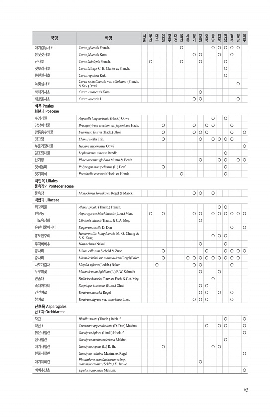 63 국명 학명 서 울 부산 대구 인천 광주 대전 울산 세종 경기 강원 충북 충남 전북 전남 경북 경남 제주 애기감둥사초 Carex gifuensis Franch. ○ ○ ○ ○ ○ ○ 참삿갓사초 Carex jaluensis Kom. ○ ○ ○ ○ 난사초 Carex lasiolepis Franch. ○ ○ ○ ○ 갯보리사초 Carex laticeps C. B. Clarke ex Franch. ○ 큰천일사초 Carex rugulosa Kuk. ○ 녹빛실사초 Carex sachalinensis var. sikokiana Franch. & Sav. Ohwi ○ 싸래기사초 Carex ussuriensis Kom. ○ 새방울사초 Carex vesicaria L. ○ ○ ○ 벼목 Poales 화본과 Poaceae 수염...