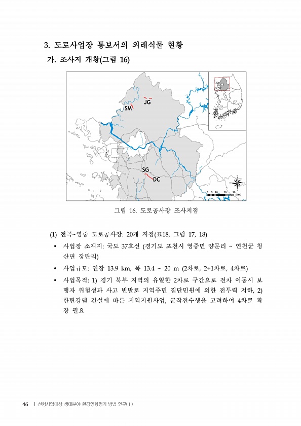도로사업장 통보서의 외래식물 현황 가 조사지 개황 그림 그림 도로공사장 조사지점 전곡 영중 도로공사장 개 지점 표 그림 ? 사업장 소재지 국도 호선 경기도 포천시 영중면 양문리 연천군 청 산면 장탄리 ? 사업규모 연장 폭 차로 차로 차로 ? 사업목적 경기 북부 지역의 유일한 차로 구간으로 전차 이동시 보 행자 위험성과 사고 빈발로 지역주민 집단민원에 의한 전투력 저하 한탄강댐 건설에 따른 지역지원사업 군작전수행을 고려하여 차로 확 장 필요 46 | 선형사업대상 생태분야 환경영향평가 방법 연구 Ⅰ