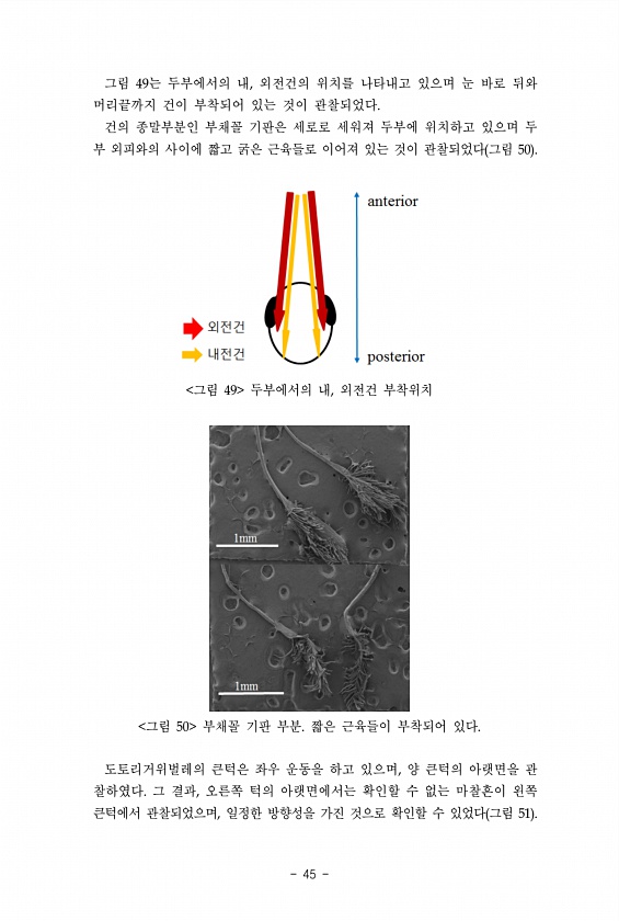 45 그림 49는 두부에서의 내, 외전건의 위치를 나타내고 있으며 눈 바로 뒤와 머리끝까지 건이 부착되어 있는 것이 관찰되었다. 건의 종말부분인 부채꼴 기판은 세로로 세워져 두부에 위치하고 있으며 두 부 외피와의 사이에 짧고 굵은 근육들로 이어져 있는 것이 관찰되었다 그림 50 그림 49 두부에서의 내, 외전건 부착위치 그림 50 부채꼴 기판 부분. 짧은 근육들이 부착되어 있다. 도토리거위벌레의 큰턱은 좌우 운동을 하고 있으며, 양 큰턱의 아랫면을 관 찰하였다. 그 결과, 오른쪽 턱의 아랫면에서는 확인할 수 없는 마찰흔이 왼쪽 큰턱에서 관찰되었으며, 일정한 방향성을 가진 것으로 확인할 수 있었다 그림 51