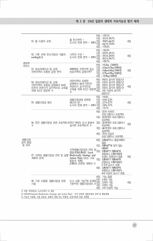 47 제 3 장 DMZ 일원의 생태적 지속가능성 평가 체계 생태계 서비스 11. 물 수량의 규제 총 투수면적 ÷ 도시의 전체 면적 × 100% 0점 33.1% 1점 33.1%-39.7% 2점 39.8%-64.2% 3점 64.3%-75.0% 4점 75.0% 4점 12. 기후 규제탄소저장과 식물의 cooling효과 나무의 수관 ÷ 도시의 전체 면적 × 100% 0점 10.5% 1점 10.5%-19.1% 2점 19.2%-29.0% 3점 29.1%-59.7% 4점 59.7% 4점 13. 레크리에이션 및 교육자연지역이 포함된 공원 면적 1000명당 자연지역 또는 보호지역의 공원지역1 0점 0.1ha /1000명 1점 0.1ha-0.3ha/1000명 2점 0.4ha-0.6ha/1000명 3점 0.7ha-0.9ha/10...