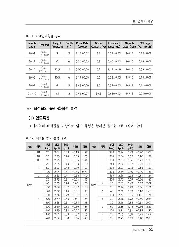 Ⅱ. 관매도 사구 www.nie.re.kr ? 55 Sample Code Transect RMSL,m Height Depth m Dose Rate Gy/ka Content % Water Equivalent Dose Gy used n/N Aliquots ka, 1σ SE OSL age GM-1 GM1 1st dune 8 2 3.16±0.08 5.6 0.39±0.02 16/16 0.12±0.01 GM-2 GM1 1st dune 6 4 3.26±0.09 6.9 0.60±0.02 16/16 0.18±0.01 GM-4 GM1 2nd dune 12.5 2 3.08±0.08 6.2 1.19±0.18 16/16 0.39±0.06 GM-5 GM1 2nd dune 10.5 4 3.17±0.09 6.5 0.33±0.03 15/...