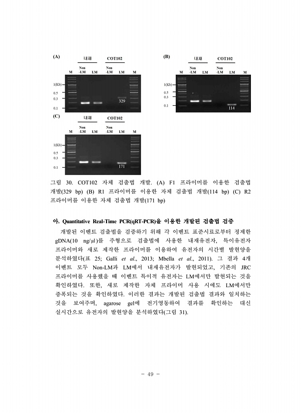 49 그림 30. COT102 자체 검출법 개발. A F1 프라이머를 이용한 검출법 개발 329 bp B R1 프라이머를 이용한 자체 검출법 개발 114 bp C R2 프라이머를 이용한 자체 검출법 개발 171 bp 아. Quantitative Real-Time PCR qRT-PCR 을 이용한 개발된 검출법 검증 개발된 이벤트 검출법을 검증하기 위해 각 이벤트 표준시료로부터 정제한 gDNA 10 ng/㎕ 를 주형으로 검출법에 사용한 내재유전자, 특이유전자 프라이머와 새로 제작한 프라이머를 이용하여 유전자의 시간별 발현양을 분석하였다 표 25; Galli et al., 2013; Mbella et al., 2011 그 결과 4개 이벤트 모두 Non-LM과 LM에서 내재유전자가 발현되었고, 기존의 JRC 프라이...