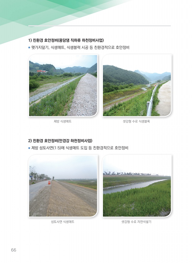 66 제방 식생매트 성토사면 식생매트 샛강형 수로 식생블록 샛강형 수로 자연석쌓기 1 친환경 호안정비 용담댐 직하류 하천정비사업 ● 왯가지덮기, 식생매트, 식생블럭 시공 등 친환경적으로 호안정비 2 친환경 호안정비 만경강 하천정비사업 ● 제방 성토사면 15 에 식생매트 도입 등 친환경적으로호안정비