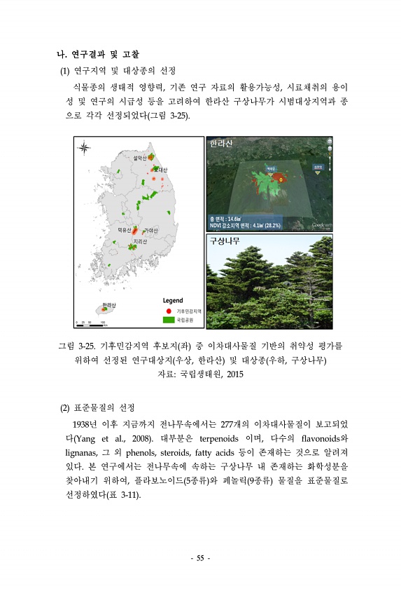 55 나. 연구결과 및 고찰 1 연구지역 및 대상종의 선정 식물종의 생태적 영향력, 기존 연구 자료의 활용가능성, 시료채취의 용이 성 및 연구의 시급성 등을 고려하여 한라산 구상나무가 시범대상지역과 종 으로 각각 선정되었다 그림 3-25 그림 3-25. 기후민감지역 후보지 좌 중 이차대사물질 기반의 취약성 평가를 위하여 선정된 연구대상지 우상, 한라산 및 대상종 우하, 구상나무 자료국립생태원, 2015 2 표준물질의 선정 1938년 이후 지금까지 전나무속에서는 277개의 이차대사물질이 보고되었 다 Yang et al., 2008 대부분은 terpenoids 이며, 다수의 flavonoids와 lignanas, 그 외 phenols, steroids, fatty acids 등이 존재하는 것으로 알려져 있다. ...