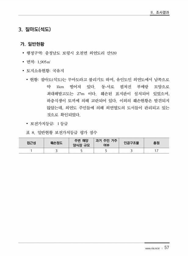 Ⅱ. 조사결과 www.nie.re.kr ? 57 3. 질마도 석도 가. 일반현황 ? 행정구역충청남도 보령시 오천면 외연도리 산539 ? 면적1,905㎡ ? 토지소유현황국유지 ? 현황질마도 석도 는 무마도라고 불리기도 하며, 유인도인 외연도에서 남쪽으로 약 1km 떨어져 있다. 동-서로 펼쳐진 부메랑 모양으로 최대해발고도는 27m 이다. 훼손된 표지판이 설치되어 있었으며, 하층식생이 토끼에 의해 교란되어 있다. 이외의 훼손현황은 발견되지 않았는데, 외연도 주민들에 의해 외연열도의 도서들이 관리되고 있는 것으로 확인되었다. ? 보전가치등급Ⅰ등급 표 8. 일반현황 보전가치등급 평가 점수 접근성 훼손정도 주변 해양 양식장 규모 과거 주민 거주 여부 인공구조물 총점 1 3 5 5 317