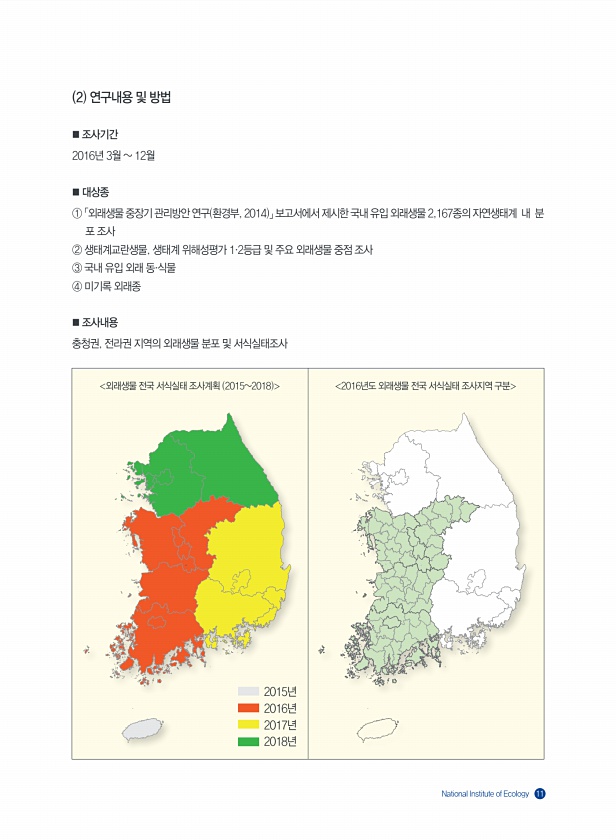 National Institute of Ecology 11 2 연구내용 및 방법 ■ 조사기간 2016년 3월 12월 ■ 대상종 ① 「외래생물 중장기 관리방안 연구 환경부, 2014 」 보고서에서 제시한 국내 유입 외래생물 2,167종의 자연생태계 내 분 포 조사 ② 생태계교란생물, 생태계 위해성평가 1·2등급 및 주요 외래생물 중점 조사 ③ 국내 유입 외래 동·식물 ④ 미기록 외래종 ■ 조사내용 충청권, 전라권 지역의 외래생물 분포 및 서식실태조사 2015년 2016년 2017년 2018년 첨단1동 회진면 금일읍 첨단1동 회진면 금일읍 외래생물 전국 서식실태 조사계획 20152018 2016년도 외래생물 전국 서식실태 조사지역 구분