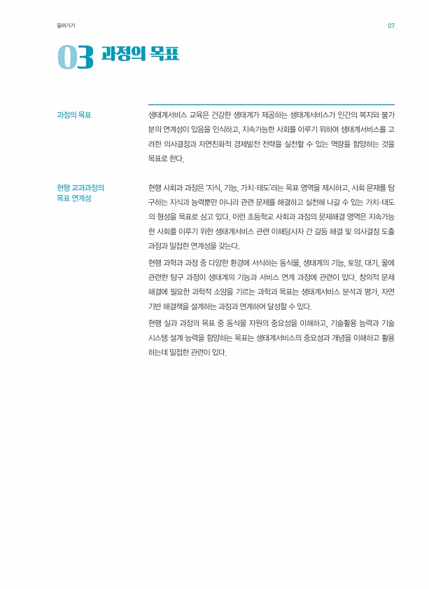 03? 과정의 목표 과정의 목표 생태계서비스 교육은 건강한 생태계가 제공하는 생태계서비스가 인간의 복지와 불가 분의 연계성이 있음을 인식하고, 지속가능한 사회를 이루기 위하여 생태계서비스를 고 려한 의사결정과 자연친화적 경제발전 전략을 실천할 수 있는 역량을 함양하는 것을 목표로 한다. 현행 사회과 과정은 ‘지식, 기능, 가치·태도’라는 목표 영역을 제시하고, 사회 문제를 탐 구하는 지식과 능력뿐만 아니라 관련 문제를 해결하고 실천해 나갈 수 있는 가치·태도 의 형성을 목표로 삼고 있다. 이런 초등학교 사회과 과정의 문제해결 영역은 지속가능 한 사회를 이루기 위한 생태계서비스 관련 이해당사자 간 갈등 해결 및 의사결정 도출 과정과 밀접한 연계성을 갖는다. 현행 과학과 과정 중 다양한 환경에 서식하는 동식물,...