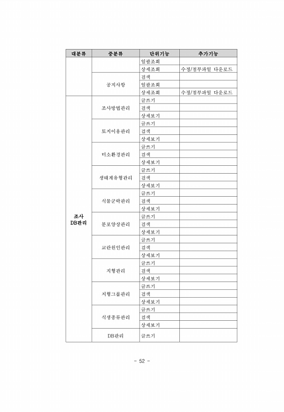 52 대분류 중분류 단위기능 추가기능 일괄조회 상세조회 수정/첨부파일 다운로드 공지사항 검색 일괄조회 상세조회 수정/첨부파일 다운로드 조사 DB관리 조사방법관리 글쓰기 검색 상세보기 토지이용관리 글쓰기 검색 상세보기 미소환경관리 글쓰기 검색 상세보기 생태계유형관리 글쓰기 검색 상세보기 식물군락관리 글쓰기 검색 상세보기 분포양상관리 글쓰기 검색 상세보기 교란원인관리 글쓰기 검색 상세보기 지형관리 글쓰기 검색 상세보기 지형그룹관리 글쓰기 검색 상세보기 식생종류관리 글쓰기 검색 상세보기 DB관리글쓰기