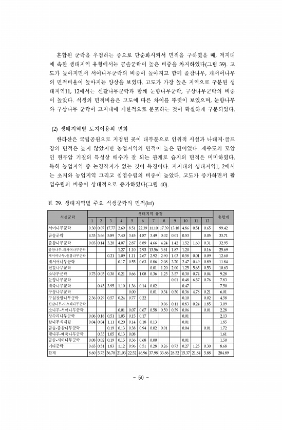 50 혼합된 군락을 우점하는 종으로 단순화시켜서 면적을 구하였을 때, 저지대 에 속한 생태지역 유형에서는 곰솔군락이 높은 비중을 차지하였다 그림 39 고 도가 높아지면서 서어나무군락의 비중이 높아지고 함께 졸참나무, 개서어나무 의 면적비율이 높아지는 양상을 보였다. 고도가 가장 높은 지역으로 구분된 생 태지역11, 12에서는 신갈나무군락과 함께 눈향나무군락, 구상나무군락의 비중 이 높았다. 식생의 면적비율은 고도에 따른 차이를 뚜렷이 보였으며, 눈향나무 와 구상나무 군락이 고지대에 제한적으로 분포하는 것이 확실하게 구분되었다. 2 생태지역별 토지이용의 변화 한라산은 국립공원으로 지정된 곳이 대부분으로 인위적 시설과 나대지·골프 장의 면적은 높지 않았지만 농업지역의 면적이 높은 편이었다. 제주도의 모암 인 현...
