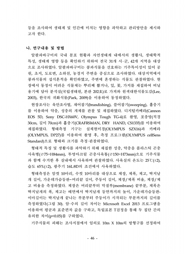 46 등을 조사하여 생태계 및 인간에 미치는 영향을 파악하고 관리방안을 제시하 고자 한다. 나. 연구내용 및 방법 알팔파바구미의 국내 분포 현황과 자연생태계 내에서의 생활사, 생태학적 특성, 생태계 영향 등을 확인하기 위하여 전국 31개 시?군, 42개 지역을 대상 으로 조사하였다. 알팔파바구미는 콩과식물을 선호하는 기주특이성이 있어 공 원, 초지, 도로변, 소하천, 농경지 주변을 중심으로 조사하였다. 대상지역에서 콩과식물의 섭식흔적을 확인하였고, 주변에 혼생하는 식물도 관찰하였다. 현 장에서 동정이 어려운 식물체는 뿌리째 뽑거나, 잎, 꽃, 가지를 채집하여 비닐 용기에 담아 분석실 국립생태원, 본관 202호 로 가져와 원색대한식물도감 Lee, 2003 , 한국의 귀화식물 Park, 2009 을 이용하여 동...
