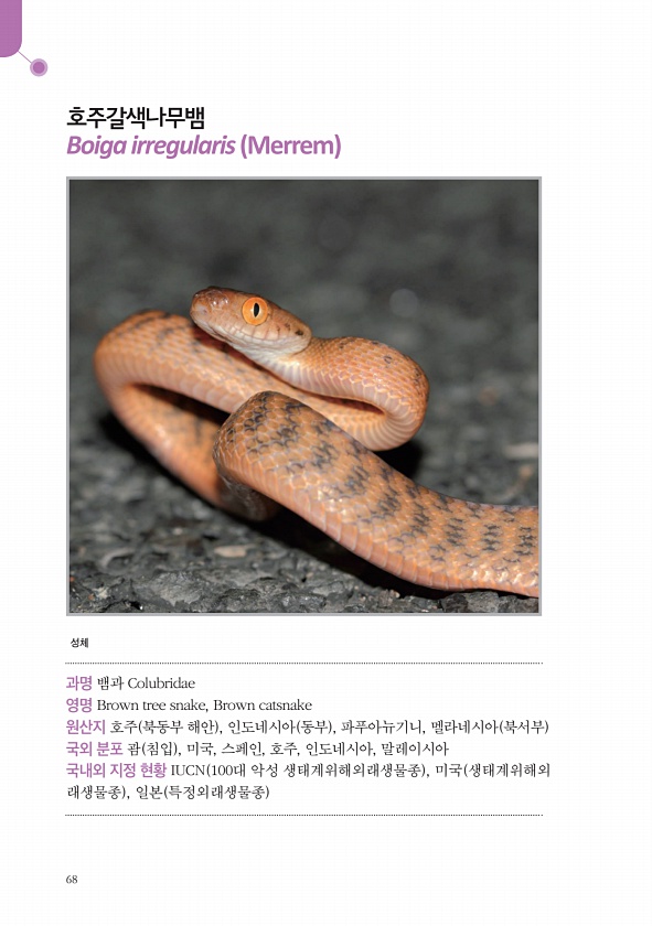 68 호주갈색나무뱀 Boiga irregularis Merrem 과명 뱀과 Colubridae 영명 Brown tree snake, Brown catsnake 원산지 호주 북동부 해안 , 인도네시아 동부 , 파푸아뉴기니, 멜라네시아 북서부 국외 분포 괌 침입 , 미국, 스페인, 호주, 인도네시아, 말레이시아 국내외 지정 현황 IUCN 100대 악성 생태계위해외래생물종 , 미국 생태계위해외 래생물종 , 일본 특정외래생물종성체
