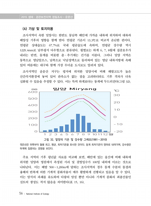 2015 생태·경관보전지역 정밀조사 운문산 56 ? National Institute of Ecology 4 기상 및 토지이용 조사지역이 속한 밀양시는 한반도 동남쪽 해안에 가까운 내륙에 위치하여 대륙과 해양성 기후의 영향을 함께 받아 연평균 기온이 13.3℃로 비교적 온난한 편이다. 연평균 상대습도는 67.7%로 국내 평균습도에 속하며, 연평균 강수량 역시 1229.4mm로 남부평지 다우형으로 분류된다. 월별로는 하계 6, 7, 8월에 집중호우가 내리는 반면, 동계를 비롯한 춘·추기에는 건기를 이룬다. 그러나 밀양 지역은 동쪽으로 영남알프스, 남쪽으로 낙남정맥으로 둘러싸여 있는 영남 내륙지방에 속해 있어 여름에는 대구와 함께 가장 무더운 도시로도 알려져 있다. 조사지역인 운문산 지구는 평지에 위치한 밀양시...