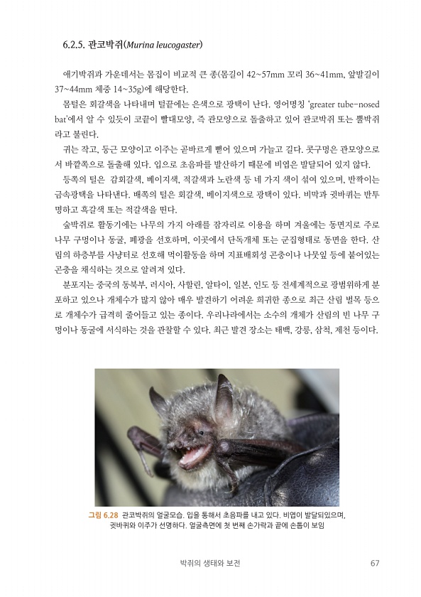 박쥐의 생태와 보전 67 6.2.5. 관코박쥐 Murina leucogaster 애기박쥐과 가운데서는 몸집이 비교적 큰 종 몸길이 4257mm 꼬리 3641mm, 앞발길이 3744mm 체중 1435g 에 해당한다. 몸털은 회갈색을 나타내며 털끝에는 은색으로 광택이 난다. 영어명칭 ‘greater tube-nosed bat에서 알 수 있듯이 코끝이 빨대모양, 즉 관모양으로 돌출하고 있어 관코박쥐 또는 뿔박쥐 라고 불린다. 귀는 작고, 둥근 모양이고 이주는 곧바르게 뻗어 있으며 가늘고 길다. 콧구멍은 관모양으로 서 바깥쪽으로 돌출해 있다. 입으로 초음파를 발산하기 때문에 비엽은 발달되어 있지 않다. 등쪽의 털은 감회갈색, 베이지색, 적갈색과 노란색 등 네 가지 색이 섞여 있으며, 반짝이는 금속광택을 나타낸다. ...