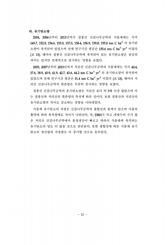 52 라 유기탄소량 년부터 년까지 점봉산 신갈나무군락의 식물체에는 각각 의 유기탄 소량이 축적되어 있었으며 전체 연구기간 평균은 이었다 표 해마다 점봉산 신갈나무군락에 축적되어 있는 유기탄소량은 증감의 차이는 있지만 전체적으로 증가하는 경향을 보였다 년부터 년까지 지리산 신갈나무군락의 식물체에는 각각 의 유기탄소량이 축적되어 있었으며 전체 연구기간 평균은 이었다 표 해마다 지 리산 신갈나무군락의 현존량은 꾸준히 증가하는 경향을 보였다 점봉산 신갈나무군락의 유기탄소량은 지리산 보다 약 배 이상 많았으며 이 는 점봉산과 지리산의 현존량의 특성에 따른 것이다 또한 점봉산과 지리산의 유기탄소량의 차이도 감소하는 경향을 나타내었다 식물체 유기탄소의 저장은 신갈나무군락의 광합성과 관계가 있으며 식물의 활력에 따라 축적...