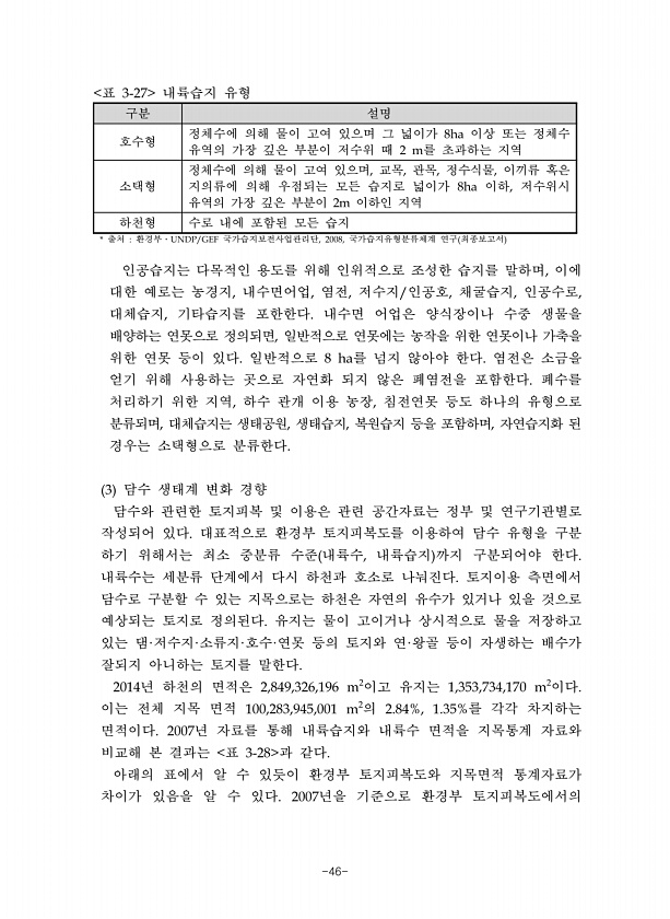 -46- 구분 설명 호수형 정체수에 의해 물이 고여 있으며 그 넓이가 이상 또는 정체수 유역의 가장 깊은 부분이 저수위 때 를 초과하는 지역 소택형 정체수에 의해 물이 고여 있으며 교목 관목 정수식물 이끼류 혹은 지의류에 의해 우점되는 모든 습지로 넓이가 이하 저수위시 유역의 가장 깊은 부분이 이하인 지역 하천형 수로 내에 포함된 모든 습지 출처 환경부 국가습지보전사업관리단 국가습지유형분류체계 연구 최종보고서 표 내륙습지 유형 인공습지는 다목적인 용도를 위해 인위적으로 조성한 습지를 말하며 이에 대한 예로는 농경지 내수면어업 염전 저수지 인공호 채굴습지 인공수로 대체습지 기타습지를 포한한다 내수면 어업은 양식장이나 수중 생물을 배양하는 연못으로 정의되면 일반적으로 연못에는 농작을 위한 연못이나 가축을 위한 ...