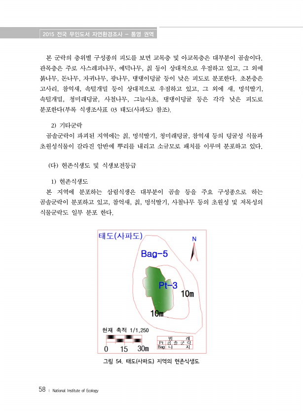 2015 전국 무인도서 자연환경조사 통영 권역 58 ? National Institute of Ecology 본 군락의 층위별 구성종의 피도를 보면 교목층 및 아교목층은 대부분이 곰솔이다. 관목층은 주로 사스레피나무, 예덕나무, 칡 등이 상대적으로 우점하고 있고, 그 외에 붉나무, 돈나무, 자귀나무, 광나무, 댕댕이덩굴 등이 낮은 피도로 분포한다. 초본층은 고사리, 참억새, 속털개밀 등이 상대적으로 우점하고 있고, 그 외에 새, 멍석딸기, 속털개밀, 청미래덩굴, 사철나무, 그늘사초, 댕댕이덩굴 등은 각각 낮은 피도로 분포한다 부록 식생조사표 03 태도 사파도 참조 2 기타군락 곰솔군락이 파괴된 지역에는 칡, 멍석딸기, 청미래덩굴, 참억새 등의 덩굴성 식물과 초원성식물이 갈라진 암반에 뿌리를 내리고 소규모로 ...