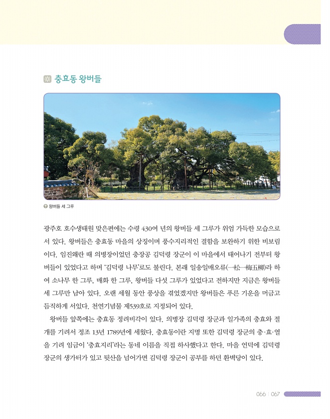 066 067 충효동 왕버들 광주호 호수생태원 맞은편에는 수령 430여 년의 왕버들 세 그루가 위엄 가득한 모습으로 서 있다. 왕버들은 충효동 마을의 상징이며 풍수지리적인 결함을 보완하기 위한 비보림 이다. 임진왜란 때 의병장이었던 충장공 김덕령 장군이 이 마을에서 태어나기 전부터 왕 버들이 있었다고 하며 ‘김덕령 나무’로도 불린다. 본래 일송일매오류 一松一梅五柳 라 하 여 소나무 한 그루, 매화 한 그루, 왕버들 다섯 그루가 있었다고 전하지만 지금은 왕버들 세 그루만 남아 있다. 오랜 세월 동안 풍상을 겪었겠지만 왕버들은 푸른 기운을 머금고 듬직하게 서있다. 천연기념물 제539호로 지정되어 있다. 왕버들 앞쪽에는 충효동 정려비각이 있다. 의병장 김덕령 장군과 일가족의 충효와 절 개를 기려서 정조 13년 1...