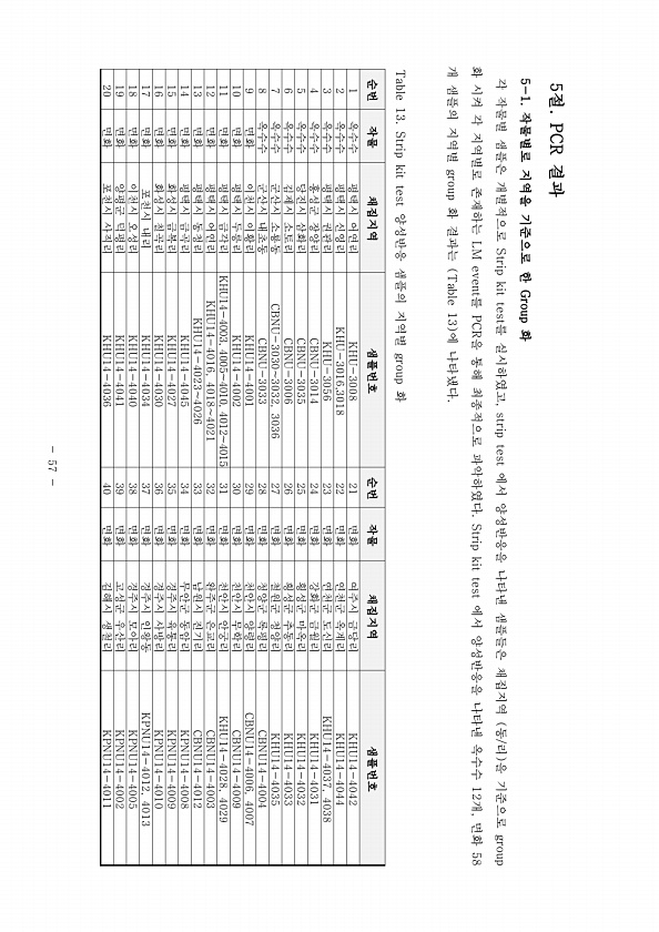 57 5절. PCR 결과 5-1. 작물별로 지역을 기준으로 한 Group 화 각 작물별 샘플은 개별적으로 Strip kit test를 실시하였고, strip test 에서 양성반응을 나타낸 샘플들은 채집지역 동/리 을 기준으로 group 화 시켜 각 지역별로 존재하는 LM event를 PCR을 통해 최종적으로 파악하였다. Strip kit test 에서 양성반응을 나타낸 옥수수 12개, 면화 58 개 샘플의 지역별 group 화 결과는 Table 13 에 나타냈다. 순번 작물 채집지역 샘플번호 순번 작물 채집지역 샘플번호 1 옥수수 평택시 어연리 KHU-3008 21 면화 여주시 금당리 KHU14-4042 2 옥수수 평택시 신영리 KHU-3016,3018 22 면화 연천군 옥계리 KHU14-4044 3 옥수...