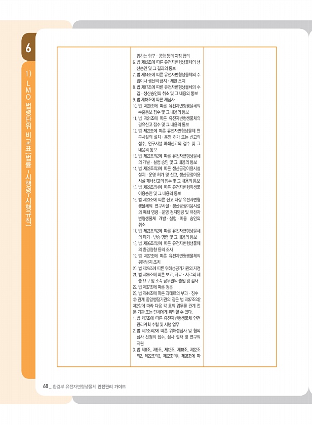 6 68 _ 환경부 유전자변형생물체 안전관리 가이드 1 L M O 법령단위 비교표 법률- 시행령- 시행규칙 입하는 항구ㆍ공항 등의 지정 협의 6. 법 제12조에 따른 유전자변형생물체의 생 산승인 및 그 결과의 통보 7. 법 제14조에 따른 유전자변형생물체의 수 입이나 생산의 금지ㆍ제한 조치 8. 법 제17조에 따른 유전자변형생물체의 수 입ㆍ생산승인의 취소 및 그 내용의 통보 9. 법 제18조에 따른 재심사 10. 법 제20조에 따른 유전자변형생물체의 수출통보 접수 및 그 내용의 통보 11. 법 제21조에 따른 유전자변형생물체의 경유신고 접수 및 그 내용의 통보 12. 법 제22조에 따른 유전자변형생물체 연 구시설의 설치ㆍ운영 허가 또는 신고의 접수, 연구시설 폐쇄신고의 접수 및 그 내용의 통보 13. 법 제...