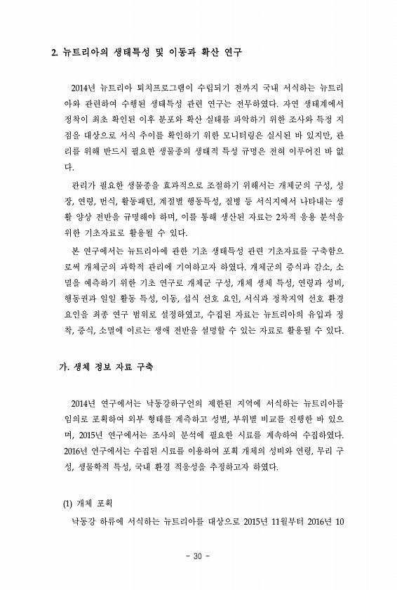 2. 뉴트리아의 생태특성 및 이동과 확산 연구 2014년 뉴트리아 퇴치프로그램이 수립되기 전까지 국내 서식하는 뉴트리 아와 관련하여 수행된 생태특성 관련 연구는 전무하였다. 자연 생태계에서 정착이 최초 확인된 이후 분포와 확산 실태를 파악하기 위한 조사와 특정 지 점을 대상으로 서식 추이를 확인하기 위한 모니터링은 실시된 바 있지만, 관 리를 위해 반드시 필요한 생물종의 생태적 특성 규명은 전혀 이루어진 바 없 다. 관리가 필요한 생물종을 효과적으로 조절하기 위해서는 개체군의 구성, 성 장, 연령, 번식, 활동패턴, 계절별 행동특성, 질병 등 서식지에서 나타내는 생 활 양상 전반을 규명해야 하며, 이를 통해 생산된 자료는 2차적 응용 분석을 위한 기초자료로 활용될 수 있다. 본 연구에서는 뉴트리아에 관한 기...
